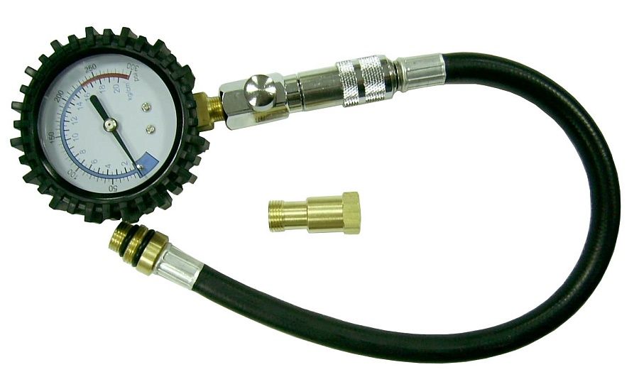 Компрессометр предназначен для диагностики состояния цилиндро-поршневой группы двигателей внутреннего сгорания. Состоит из манометра, гибкого шланга с резьбовым наконечником, запорного клапана. Гибкий шланг дает возможность добраться до свечных колодцев в условиях ограниченного пространства.