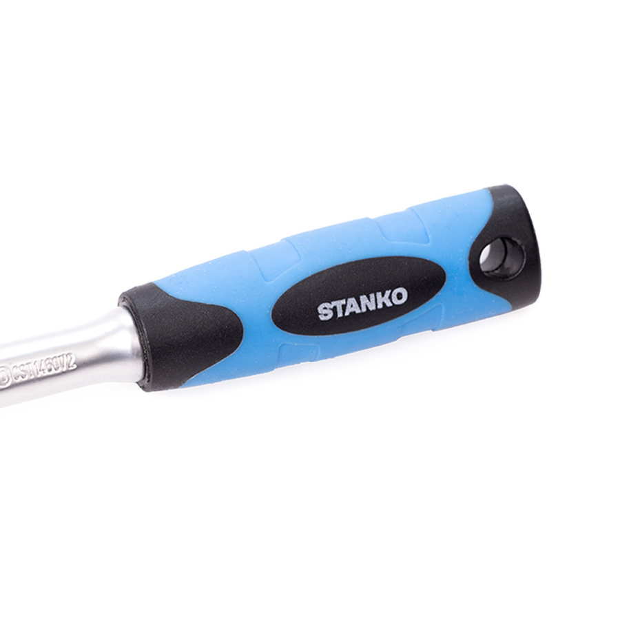 Трещотка изготовлена из высококачественной легированной хромованадиевой инструментальной стали, с последующей закалкой до твердости в пределах 46-48HRC, что обеспечивает оптимальное соотношение прочности и твердости. Эргономичная рукоять обеспечивает надежное удержание инструмента и комфортную работу, а благодаря высококачественным компонентам рукоять обладает высокой стойкостью к агрессивным средам.