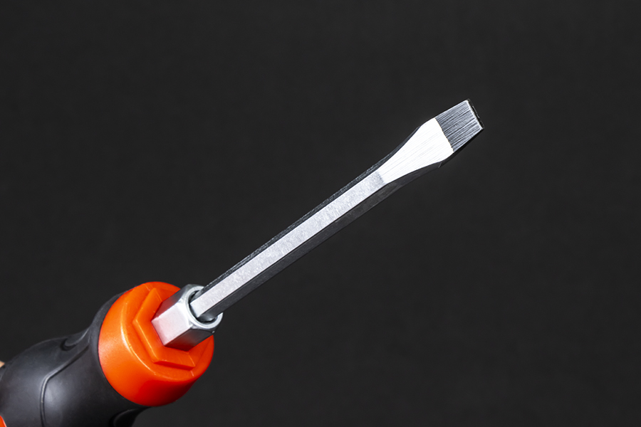 Отвертка изготовлена из высококачественной легированной хром-ванадиевой инструментальной стали, с последующей закалкой до твердости в пределах 46-48HRC, что соответствует всем требования нормативной документации. Наконечник проходит дополнительную термическую обработку с целью получения оптимального сочетания твердости и пластичности. Сквозная посадка стержня и металлический затыльник позволяют применять ударное воздействие. Шестигранный профиль у основания рукояти позволяет посредством ключа существенно увеличить усилие, передаваемое крепежу. Отвертка снабжена двухкомпонентной эргономичной рукоятью. Благодаря высококачественным компонентам рукоять имеют высокую стойкость к агрессивным средам.
